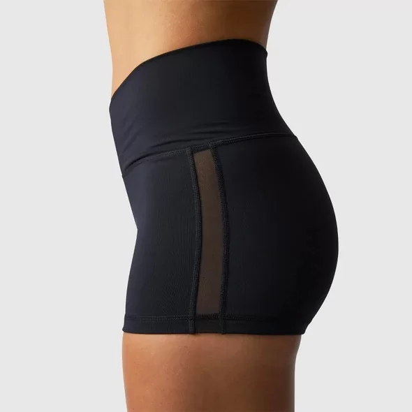 Naisten shortsit, joissa on ristikkäinen vyötärönauha edessä ja sivuilla verkkopaneelit. Näiden booty shortsien sisäsauma on 6,5cm, joten ne sopivat täydellisesti joko salille tai vapaa-aikaan.