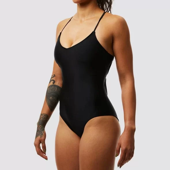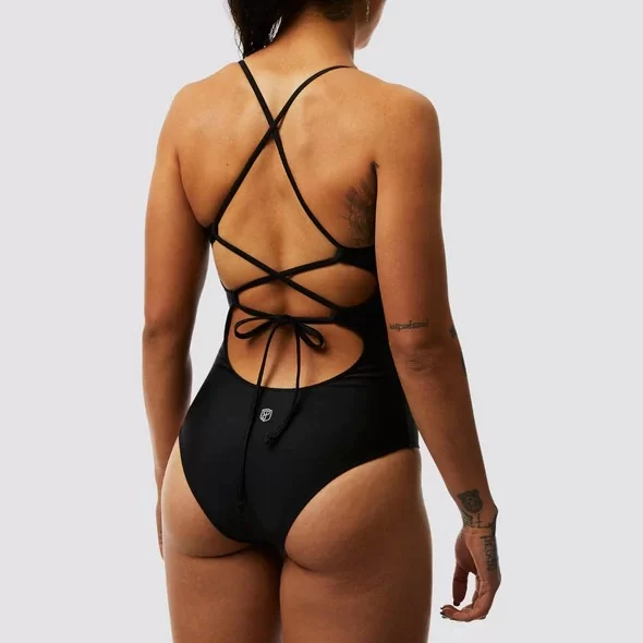 Naisten uima-asu, jossa on säädettävät olkaimet, jotka risteytyvät selässä. Lisäksi selässä solmittavat nauhat, joilla saat istuvuuden täydelliseksi.