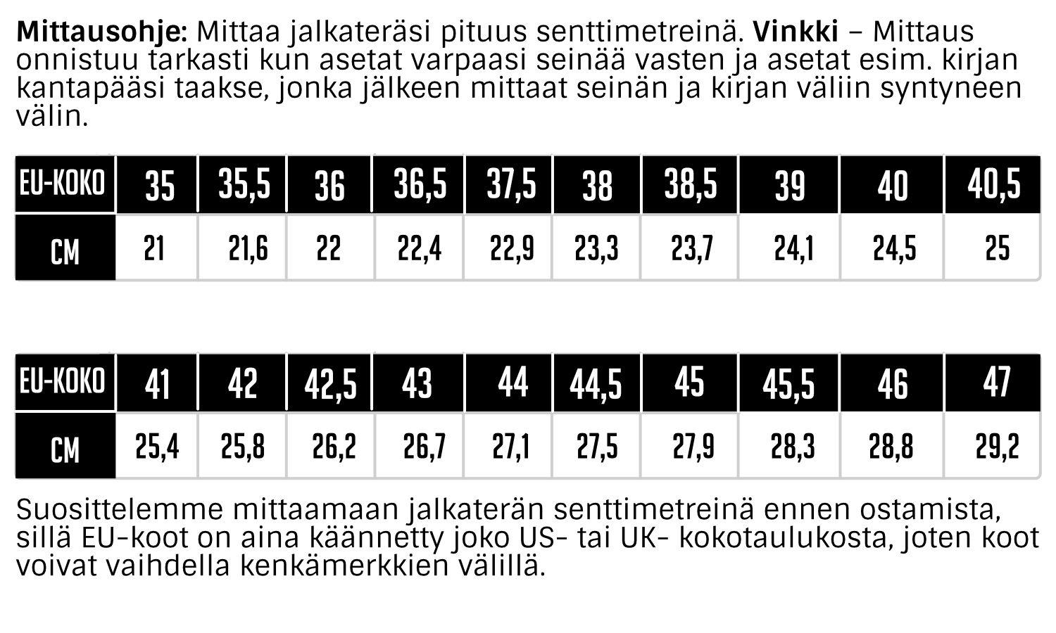 Undaunted vinkkaa: Tarkista kokosi sentteinä oheisesta kokotaulukosta ja valitse 0,5cm isompi koko. Lisätilaa sivuttaissuunnassa saat tarvittaessa lisää vaihtamalla pohjallisen ohuempaan.